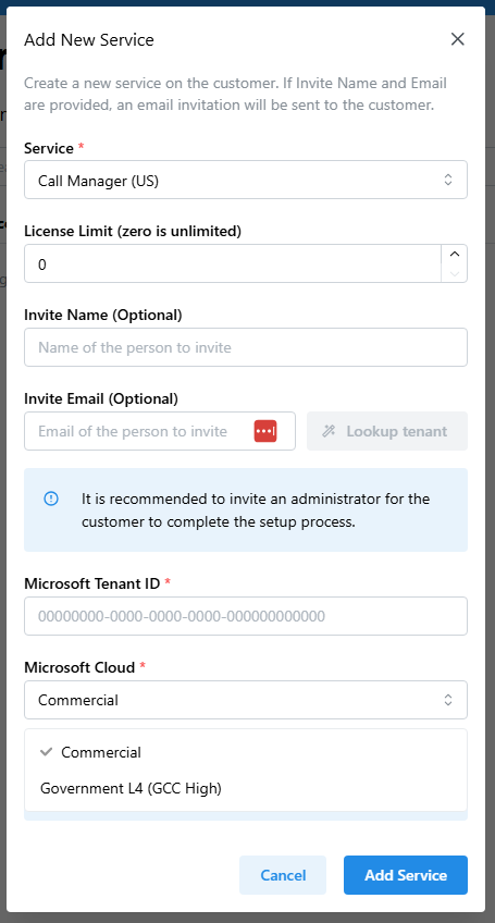 Call Manager supports both Microsoft Commercial Cloud and Microsoft GCC High (GCCH). Once configured, Provisioner will be able to create and manage both Commercial and GCCH customer tenants from a single portal.