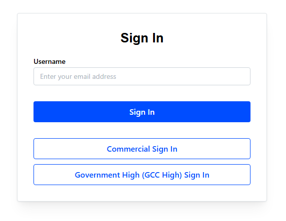 Once the username field is completed, if the primary 'Sign In' button is selected then the platform will lookup the appropriate cloud required for login based on the username's domain and Microsoft's API. Alternatively, you can specifically select to login with Commercial or GCCH clouds.