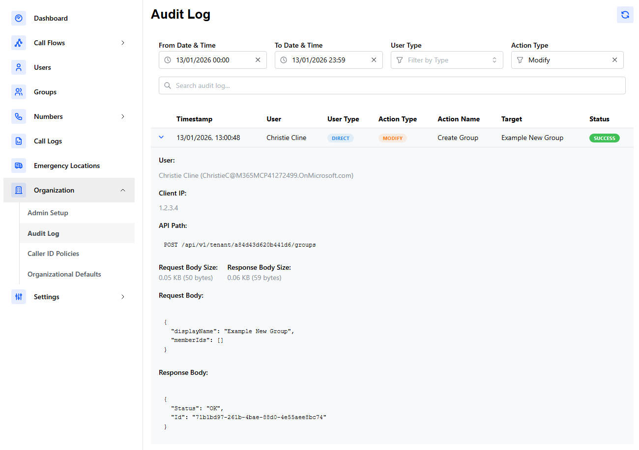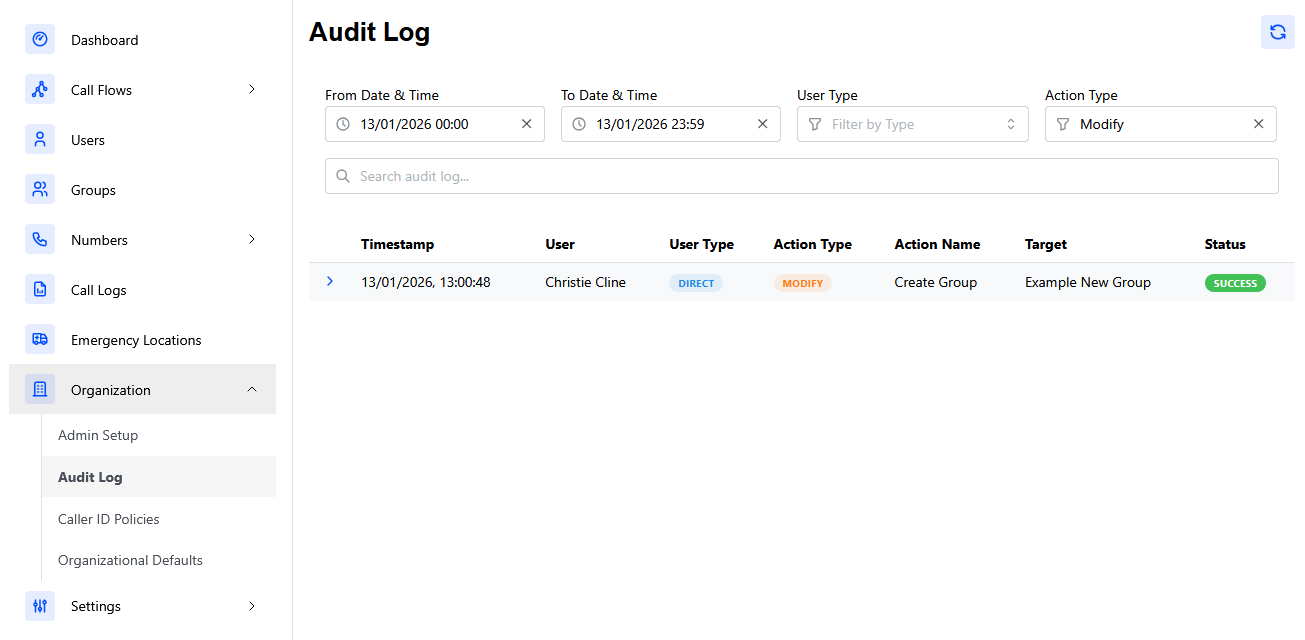 Call Manager keeps an audit log of all access and changes that take place on a tenant account. This is available directly from the Call Manager interface under 'Organization' on the left hand menu, then 'Audit Log'.