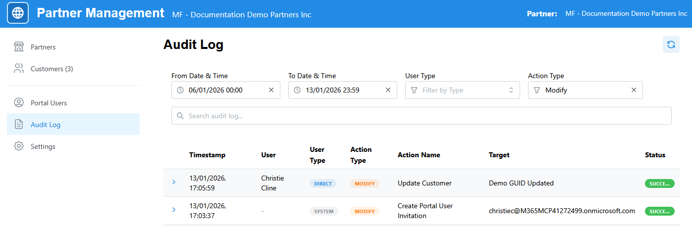 Portal Users at the Contoso level will be able to view the Audit Log for Contoso and End Reseller Inc. If a portal user from Demo Documentation Partner Inc made a change on End Reseller Inc, the Contoso user will see the change, but not who made the change.