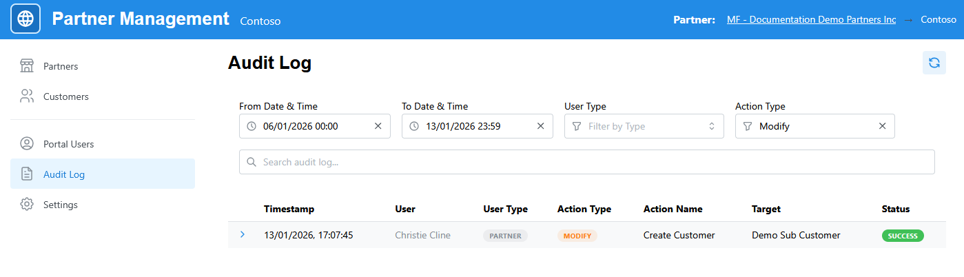 The log is shown for the current Partner. To view changes made at a child level you will need to browse to that Partner. For example, in our image above, we are logged in as a test user Christie Cline. If that user goes and creates a customer underneath the partner Contoso, which is a child partner of our Documentation Demo Partners Inc, then we will need to navigate to that partner level to see it in the Audit Log: