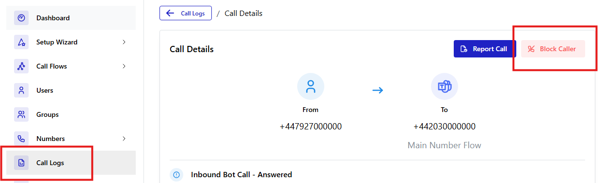 Call Manager provides a blocked number management page. This is available from the left hand side menu under Numbers > Blocked Numbers.