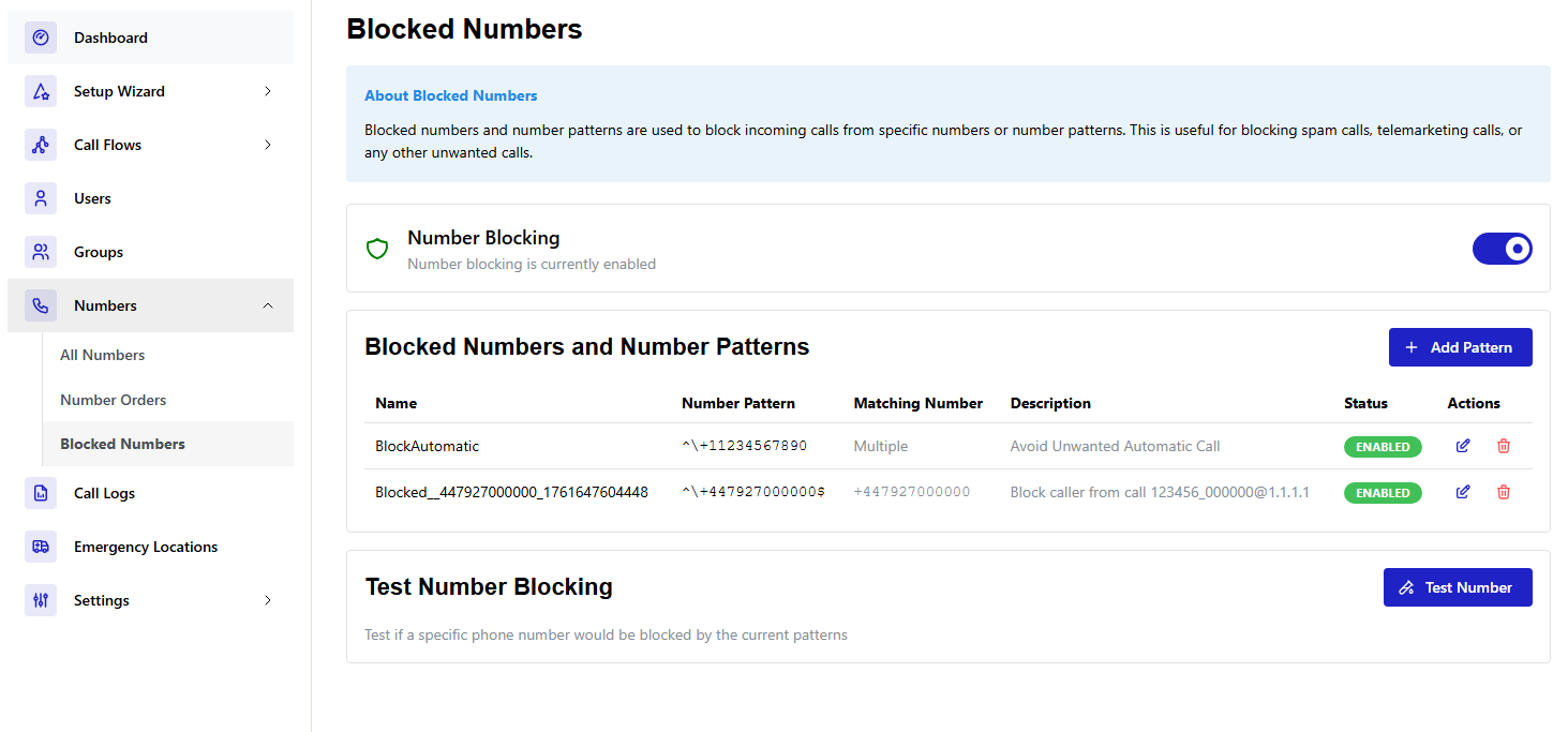 Blocked Numbers and Number Patterns lists each individual block pattern. A pattern can specify a specific number, or it can match on multiple numbers. Blocks created from the Call Log page will only match the single Caller number.