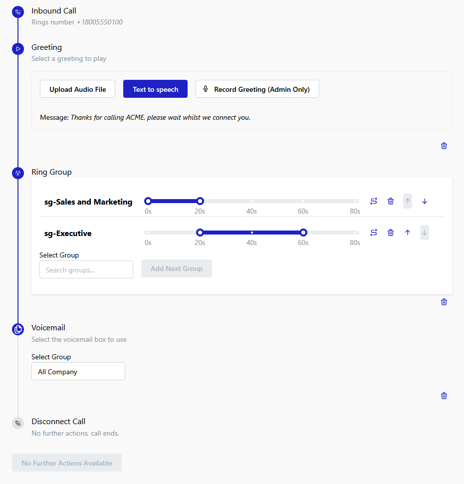 Here is an example flow that gives the user a brief message, before trying to put them through to the Sales group. If no one picks-up in Sales after 20 seconds the call overflows to the Executive team, after which it eventually reaches a voicemail box.