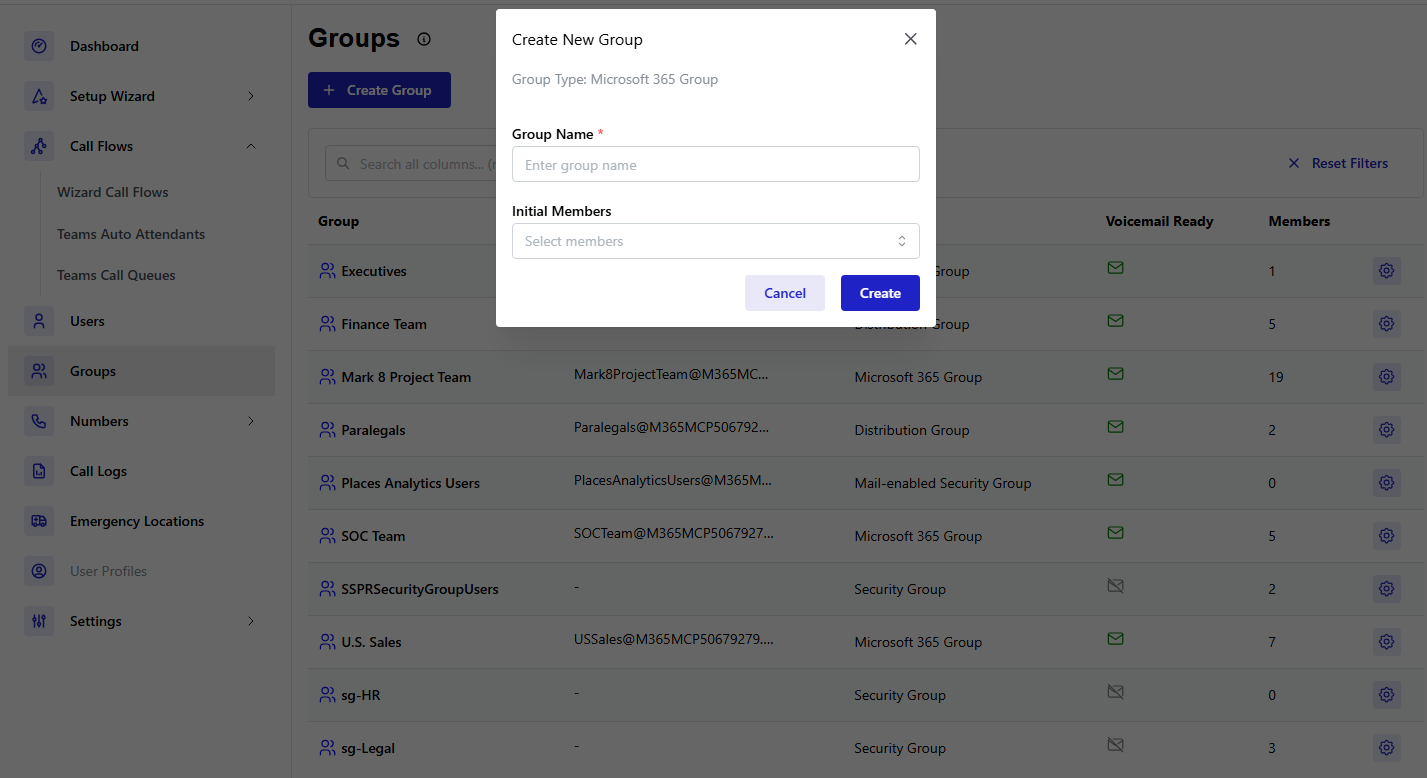 Groups represent a set of Microsoft 365 Users that can be targeted as part of a call flow. These are the same Groups that are used elsewhere in the Microsoft platform.