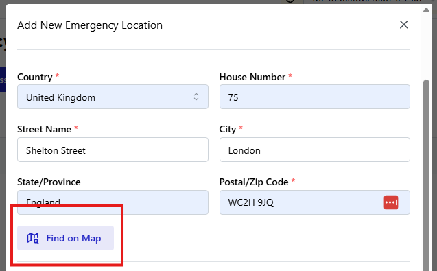 Select Add New Address. A modal will appear where you can configure the name, description and address for the office location. Complete the required fields. Once the address has been filled in, press the 'Find On Map' button.