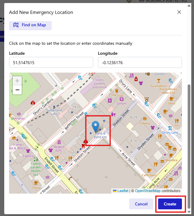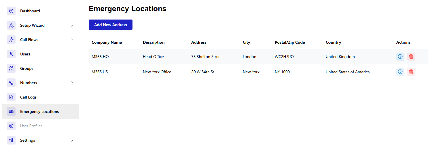 Navigate to the Emergency Location page using the left hand side menu. Any existing locations will be shown.