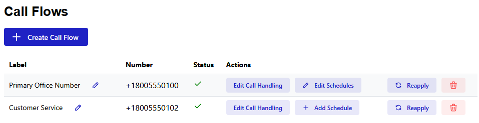 Once a call flow has been created with the wizard the UI allows future updates to take place using the same call handling wizard and schedule wizard.