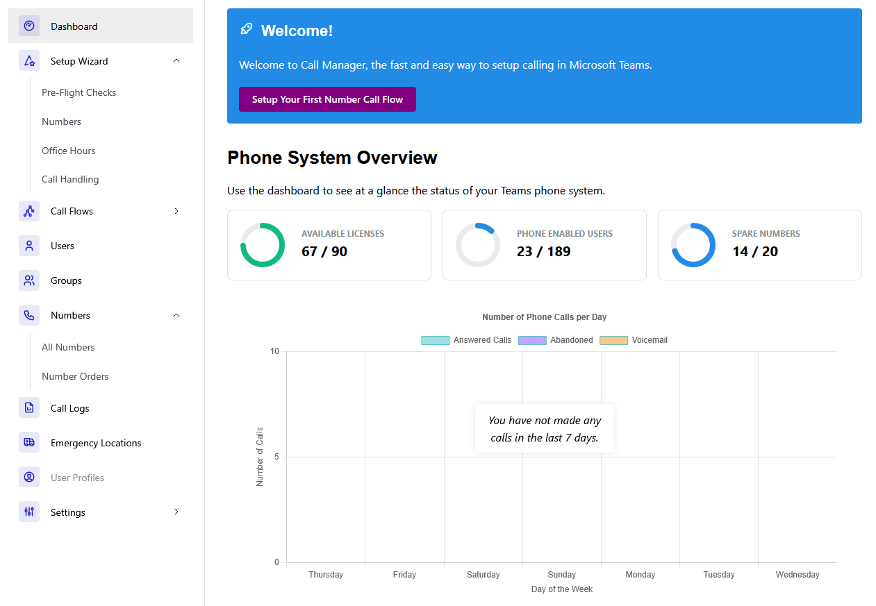 The top section will invite you to setup a wizard call flow if you have not already. A Wizard Call Flow is Call Manager's name for a phone number and call routing plan that is configured from Call Manager's Setup Wizard interface. For more information about this see the Setup Wizard page.