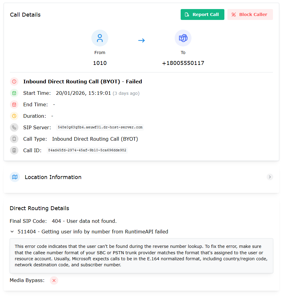 Note in this example that beyond just a 404, Microsoft has categorized this call as having error 511404. Microsoft provide some additional troubleshooting information for these specific error codes, which Call Manager displays. In this case, the 511404 is likely due to an inbound call requesting a number that isn't assigned to a user or a resource account.