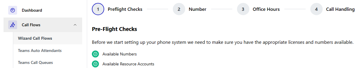 The Wizard Call Flows previously had a step-by-step section of the menu. It was also accessible via the Wizard Call Flows page. This side menu has been removed and a new top level stepper component introduced. This removes the confusion around having the same page accessible via two left side links. It also makes the wizard's steps much clearer. The image below shows the clear wizard steps are now displayed along the top of the page: